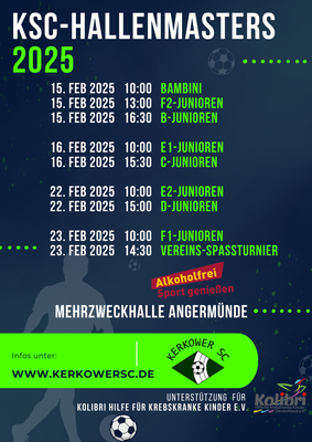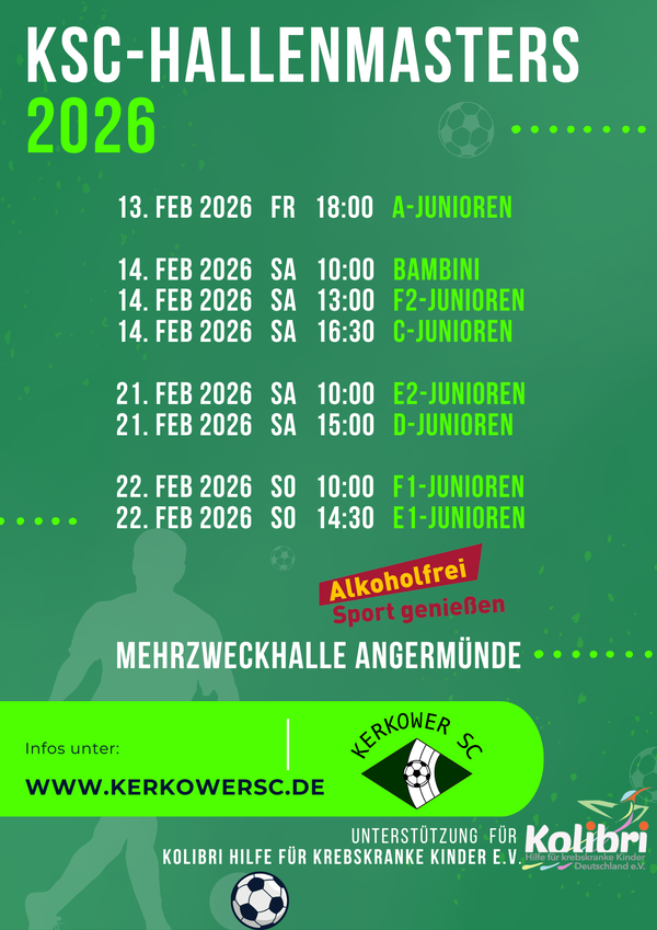 Wie schon in den Jahren 2019, 2020 und 2023 steht auch das 5. KSC-Hallenmasters 2024 unter dem Motto „Alkoholfrei Sport genießen“. Das bedeutet: Der Verein verzichtet rund um seine Nachwuchsturniere auf den Konsum von Alkohol. „Mit der Beteiligung an dieser Aktion wollen wir ein wirkungsvolles Zeichen setzen und dazu beitragen, insbesondere die Kinder und Jugendlichen in unserem Verein vor der Gefährdung durch Alkohol zu schützen“, erklärt Sören Kalz, Vorsitzender des Vereins.